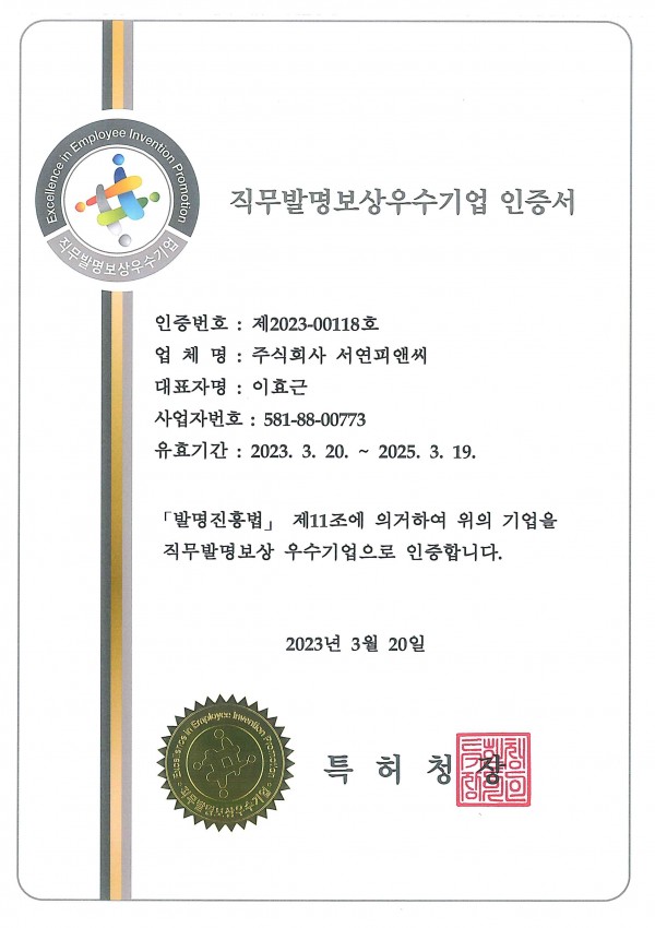 기타 직무발명보상우수기업 인증서